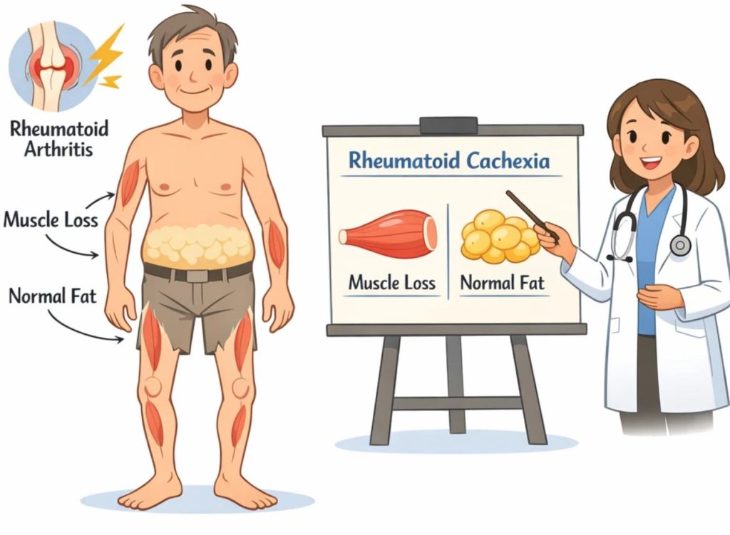 آرتریت روماتوئید (RA) میتواند منجر به یک وضعیت متابولیکی به نام کاشکسی روماتوئید یا تحلیل رفتن عضلات شود. این نوع کاشکسی زمانی اتفاق میافتد که بدن شما توده عضلانی خود را از دست میدهد و توده چربی را حفظ میکند. بدن شما به دلیل التهاب مزمن و عدم فعالیت بدنی ناشی از آرتریت روماتوئید ، این بیماری را ایجاد میکند . کاشکسی روماتوئید در افراد مبتلا به آرتریت روماتوئید شایع است. کارشناسان معتقدند که ممکن است حدود دو سوم افراد مبتلا به آرتریت روماتوئید را تحت تأثیر قرار دهد.