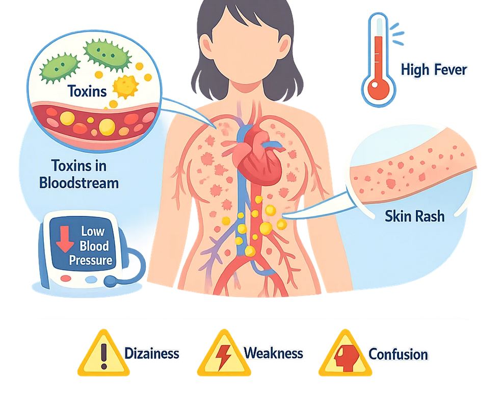 طبق گزارش CDC، سندرم شوک سمی شامل تب، بثورات پوستی، افت شدید فشار خون و شواهدی از آسیب جدی به اندامها میشود.