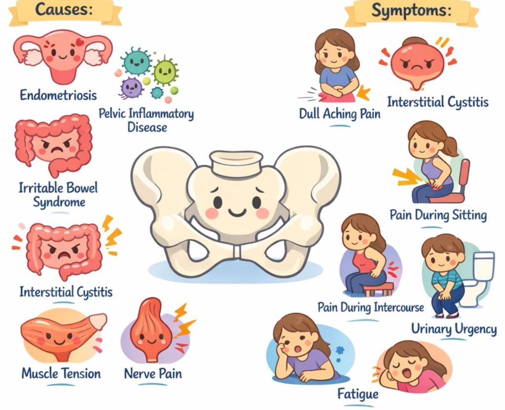بسیاری از بیماریها میتوانند باعث درد مزمن لگن شوند . همه آنها میتوانند علائم مشابهی داشته باشند و این اغلب تشخیص منبع درد را دشوار میکند. علامت اصلی دردی است که بیش از 6 ماه طول میکشد، اما معمولاً علائم دیگری نیز وجود دارد. درک علائم شما میتواند به شما و پزشکتان کمک کند تا علت یا علل درد مزمن لگن خود را مشخص کنید. در اینجا برخی از علل و علائم مرتبط با آن آورده شده است: