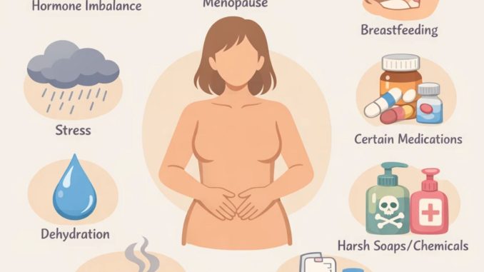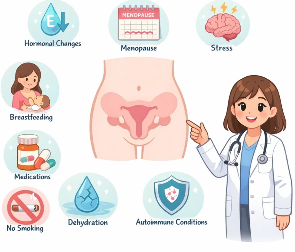 کاهش سطح استروژن، میزان رطوبت موجود را کاهش می‌دهد. این اتفاق می‌تواند در هر سنی و به دلایل مختلفی رخ دهد.