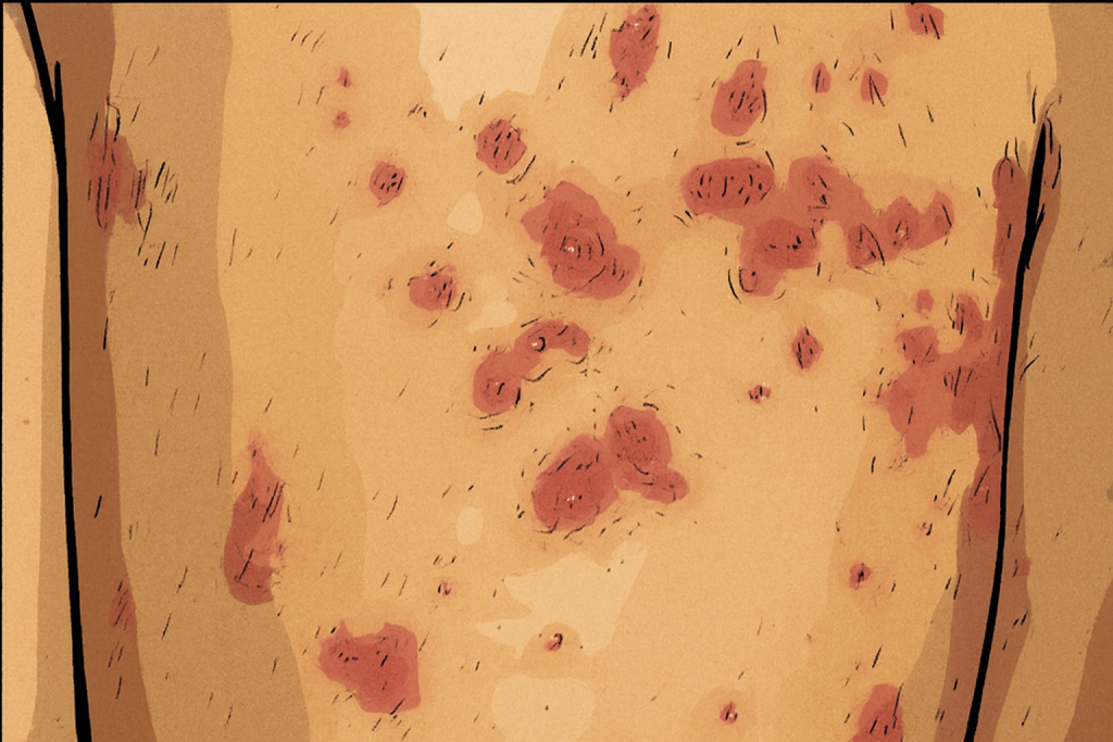 بثورات قرمز و خارشدار روی قسمتهایی از بدن که با مو یا لباس شنا پوشیده شدهاند، ظاهر میشود. این قسمتها میتواند شامل کشاله ران، انتهای بدن، قفسه سینه، شکم ، گردن یا پشت باشد. ممکن است ۲۰۰ یا بیشتر نیش خورده باشید.