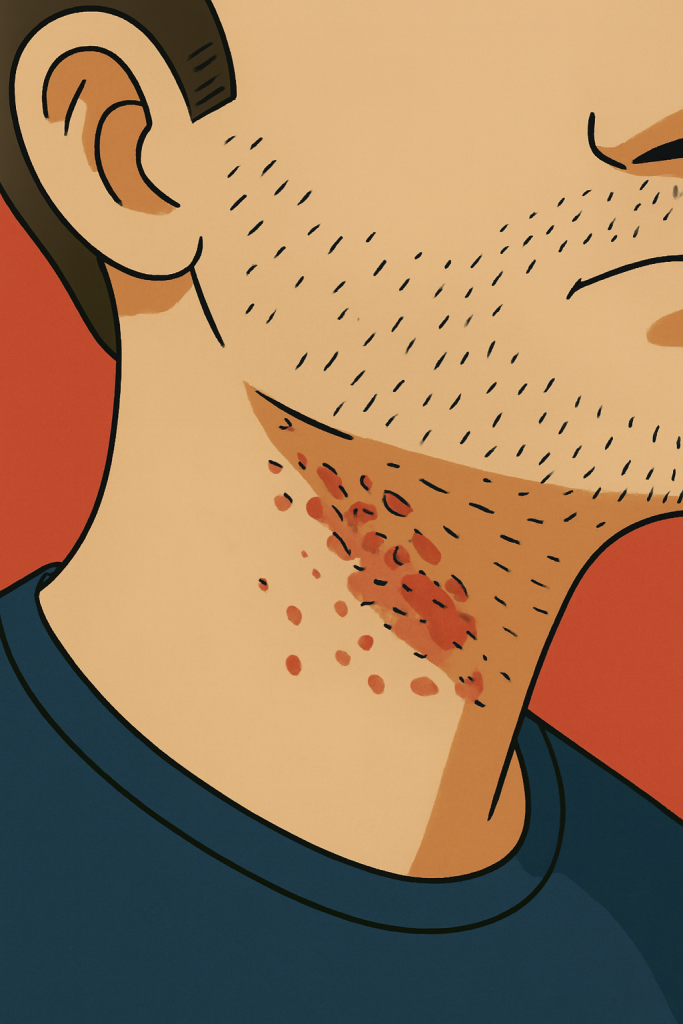 با قرار دادن یک لیف حمام خنک روی ناحیه شروع کنید. سپس چیزی را که ناحیه آسیب دیده را مرطوب کرده و سوزش را تسکین میدهد، بمالید. تا زمانی که بثورات از بین نرفته است، از اصلاح آن ناحیه خودداری کنید.