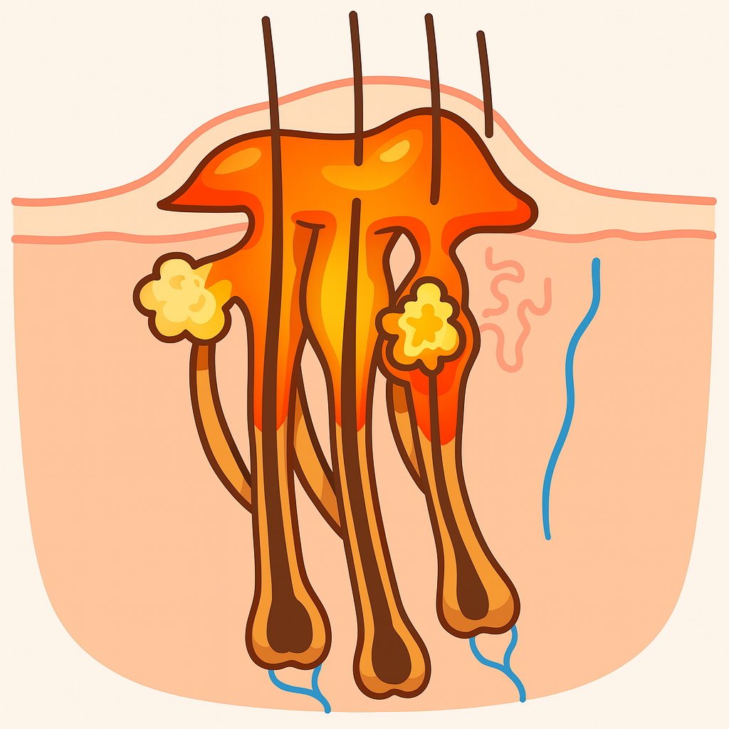 جوش‌هایی که جمع می‌شوند و کفگیرک تشکیل می‌دهند، معمولاً به صورت برآمدگی‌های قرمز و دردناک شروع می‌شوند. کفگیرک پر از چرک می‌شود و نوک‌های سفید یا زرد رنگی ایجاد می‌کند که ترشح می‌کنند، ترشح می‌کنند یا پوسته می‌دهند. در طول یک دوره چند روزه، بسیاری از کفگیرک‌های درمان نشده پاره می‌شوند و مایعی سفید یا صورتی مایل به کرم از آنها خارج می‌شود.