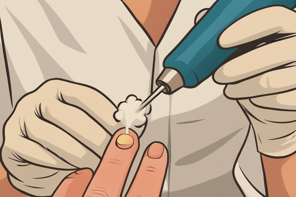 برای بزرگسالان و کودکان بزرگتر که زگیل معمولی دارند، پزشک احتمالاً میخواهد آنها را با نیتروژن مایع منجمد کند. (از آنجا که نیتروژن بسیار سرد است، میتواند برای مدتی باعث درد شدید شود، به همین دلیل برای کودکان خردسال استفاده نمیشود.) احتمالاً به بیش از یک جلسه نیاز خواهید داشت. اگر پس از بهبودی ناحیه، درمان با اسید سالیسیلیک را ادامه دهید، بهتر عمل میکند. کرایوسرجری میتواند باعث ایجاد لکههای روشن در افرادی شود که پوست تیره دارند.