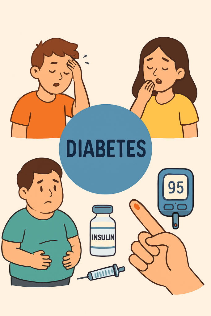 دیابت اغلب با علائم خفیفی مانند احساس گرسنگی و خستگی شدید، نیاز به دفع ادرار زیاد، تشنگی زیاد، خشکی دهان، خارش پوست و تاری دید شروع میشود. علائم دیابت نوع ۱ به سرعت ظاهر میشوند و شدیدتر هستند، در حالی که علائم دیابت نوع ۲ به آرامی بروز میکنند. در صورت داشتن علائم یا احتمال بیشتر ابتلا به دیابت، مراجعه به پزشک برای جلوگیری از مشکلات جدی سلامتی بسیار مهم است.