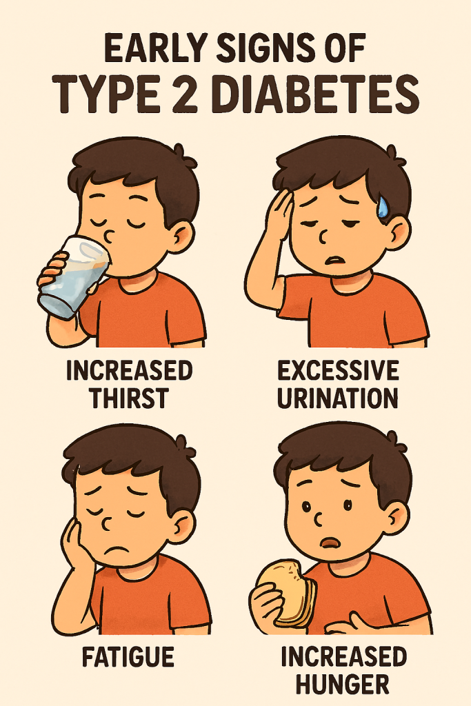 علائم اولیه زیادی برای دیابت نوع ۲ وجود دارد، از جمله تشنگی بیش از حد معمول، تکرر ادرار، خستگی و سردرد. اگر علائم جدیدی را تجربه می‌کنید، حتی اگر جزئی به نظر برسند، با پزشک خود صحبت کنید. بسیاری از افراد مبتلا به این بیماری نمی‌دانند که به آن مبتلا هستند. اکثر افراد می‌توانند علائم دیابت نوع ۲ خود را با تغییرات مناسب در سبک زندگی و داروها کنترل کنند.