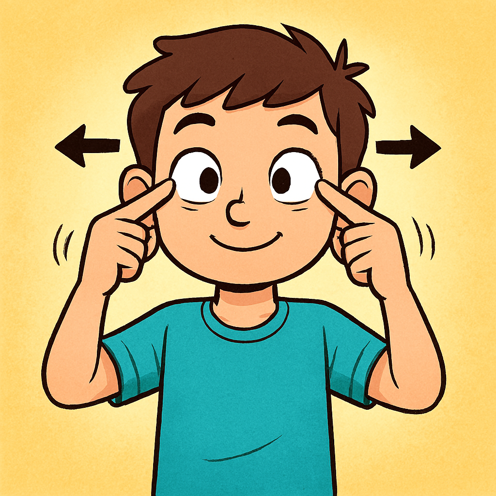 نزدیک و دور. این برای افرادی که عینک میزنند خوب است. عینک را بردارید و شستهایتان را در هوا نگه دارید، یکی نزدیک صورتتان و یکی دورتر. به مدت ۲ ثانیه روی هر شست، سپس روی شست دور، چیزی در آن سوی اتاق و چیزی حتی دورتر، مثلاً آن سوی خیابان، تمرکز کنید.