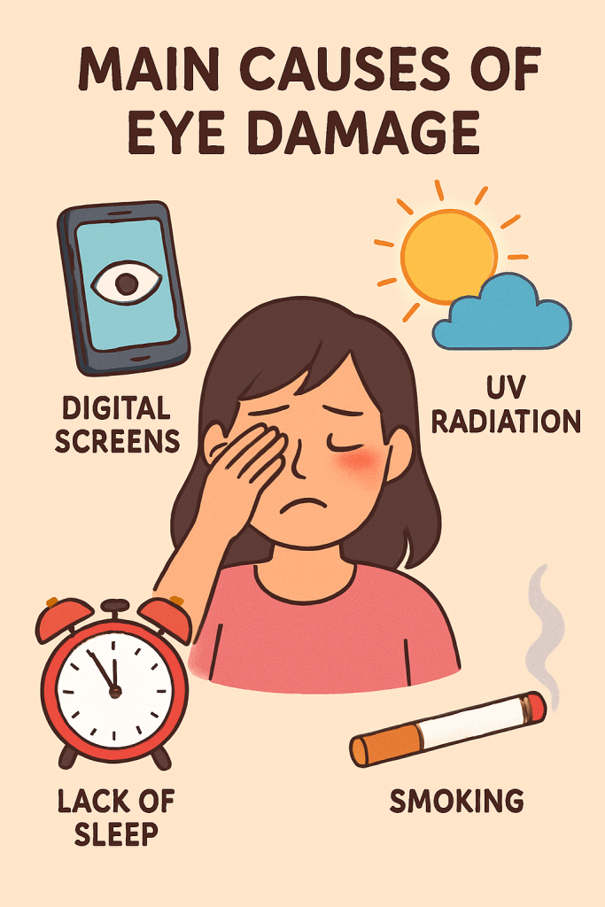 در دراز مدت، قرار گرفتن بیش از حد در معرض نور خورشید و سایر انواع تشعشعات میتواند احتمال ابتلا به آب مروارید یا دژنراسیون ماکولا، که از بین رفتن ناحیه کوچکی از شبکیه است، را افزایش دهد.