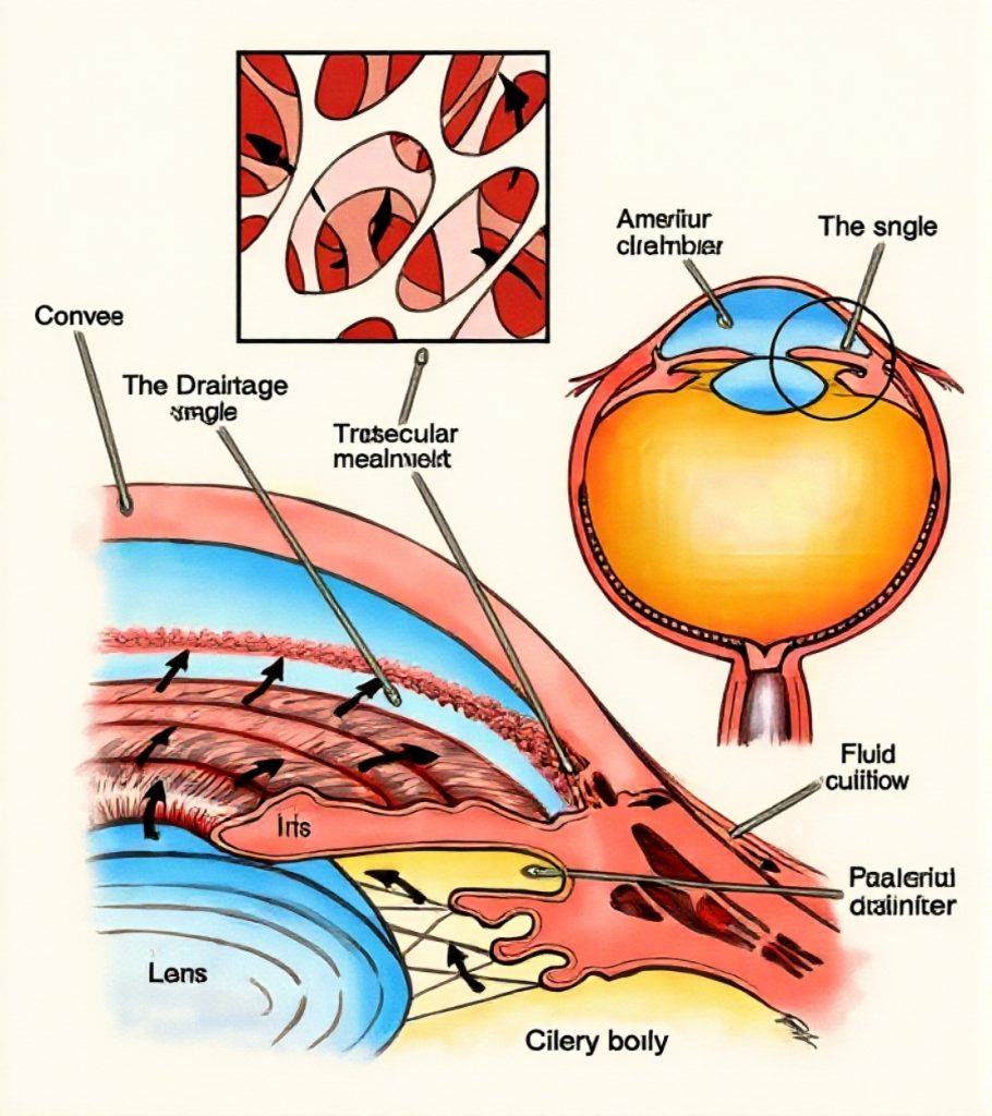 مایع از طریق سیستمی از کانالها از چشم شما خارج میشود . این کانالها در بافتی مشبک بین عنبیه (قسمت رنگی چشم) و قرار دارند.قرنیه (لایه بیرونی شفاف)