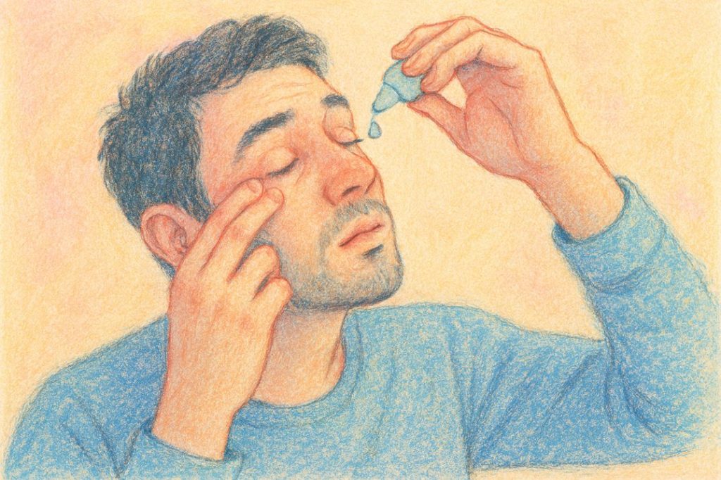 - میتوانید گوشه داخلی پلکهایتان را درست کنار بینیتان به آرامی فشار دهید تا سیستم تخلیه اشک مسدود شود و دارو از چشم خارج نشود. این کار میزان جذب دارو به چشم را به حداکثر میرساند و به کاهش میزان جذب دارو به جریان خون کمک میکند.