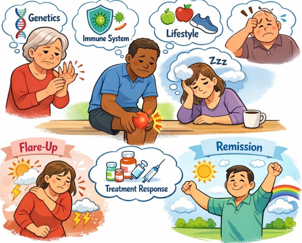 علائم آرتریت روماتوئید میتواند خفیف، شدید یا چیزی بین این دو باشد. ممکن است در دورههایی علائم تشدید شوند. سپس ممکن است دورههایی از بهبودی داشته باشید که علائم به شدت قبل نیستند یا از بین میروند.