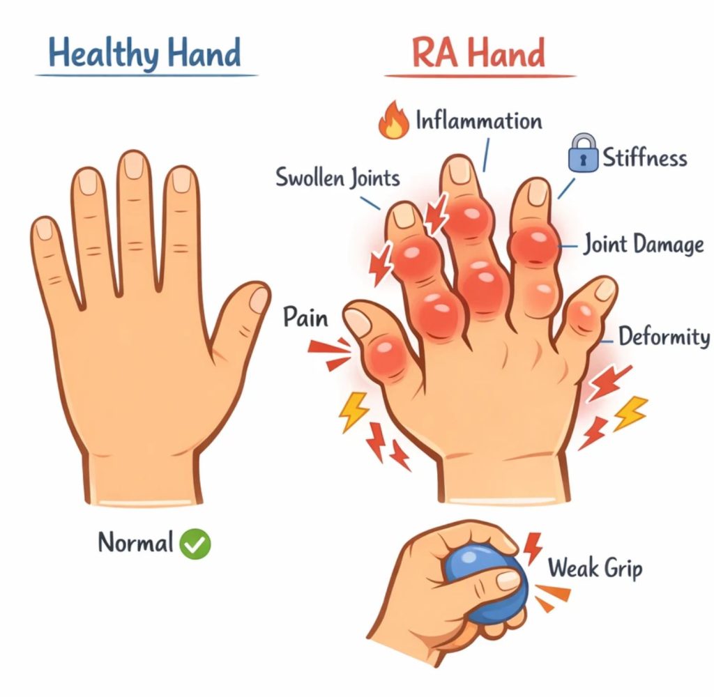 آرتریت روماتوئید (RA) یک بیماری خودایمنی است که در آن سیستم ایمنی بدن شما به بافتهای مفاصل شما حمله میکند و باعث درد، تورم و سفتی میشود. علائم میتوانند در هر مفصلی ظاهر شوند، اما داشتن علائم در دستها و انگشتان شایعتر است.