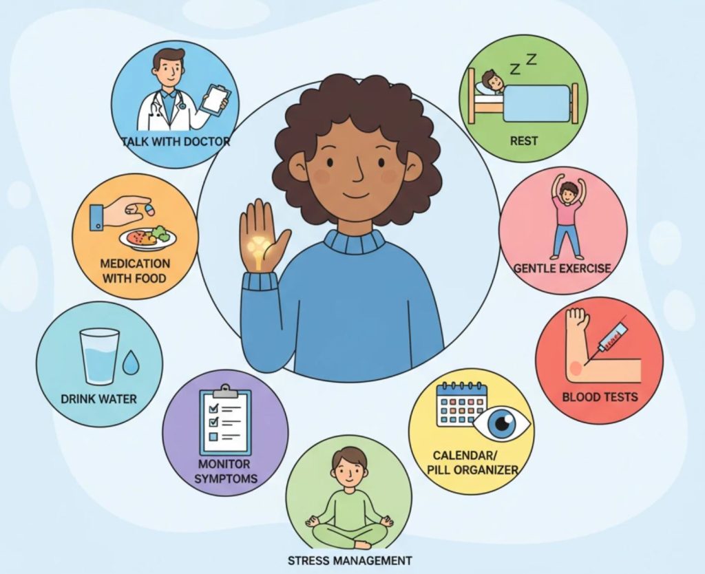 اگر هیدروکسی کلروکین مصرف میکنید، مرتباً معاینه چشم انجام دهید. آب فراوان بنوشید و اگر سولفاسالازین مصرف میکنید، از کرم ضد آفتاب استفاده کنید یا صورت خود را بپوشانید.