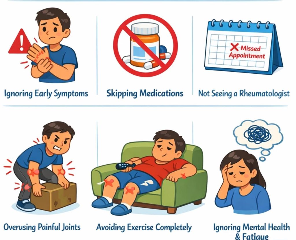 شما تمام تلاش خود را می‌کنید تا با وجود آرتریت روماتوئید ( RA ) زندگی کامل و فعالی داشته باشید . اما آیا هیچ یک از این اشتباهات رایج را می‌شناسید؟ اگر آنها آشنا به نظر می‌رسند، برای بازگشت به مسیر درست خیلی دیر نیست.