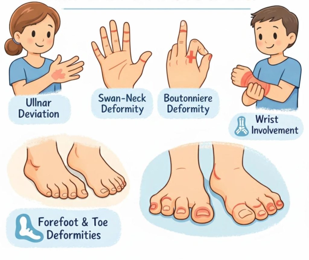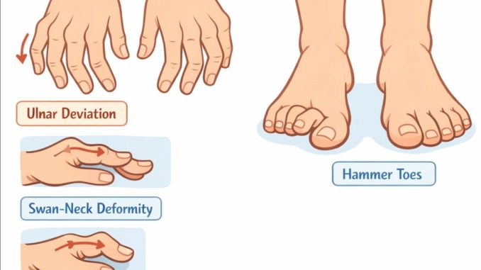 در اوایل بیماری، آرتریت روماتوئید (RA) تمایل دارد به مفاصل کوچک دستها و پاها حمله کند. این میتواند منجر به انواع مختلفی از بدشکلیها، از جمله موارد زیر شود: