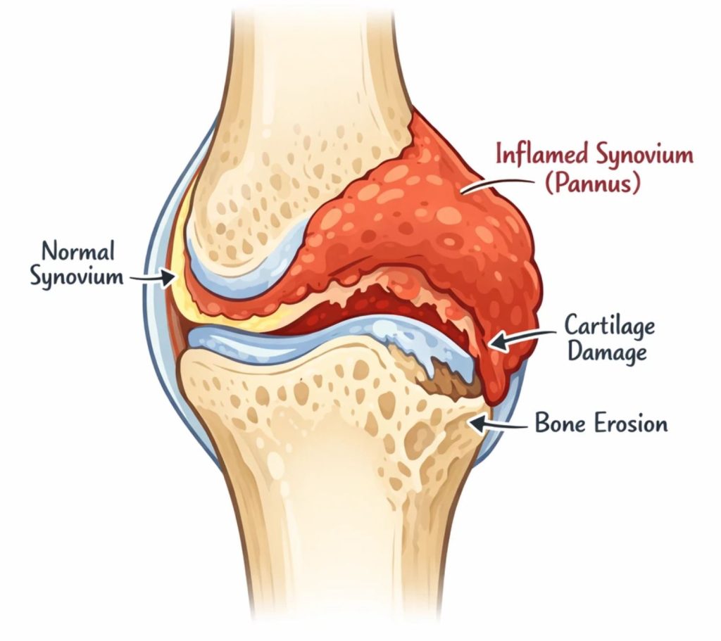 این بافت سینوویال اضافی میتواند ضخیم شود و به نواحیای که نباید، رشد کند. سلولهای ویژه سیستم ایمنی (لنفوسیتهای T و B، ماکروفاژها، ماست سلها و